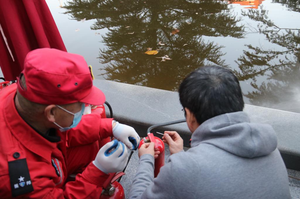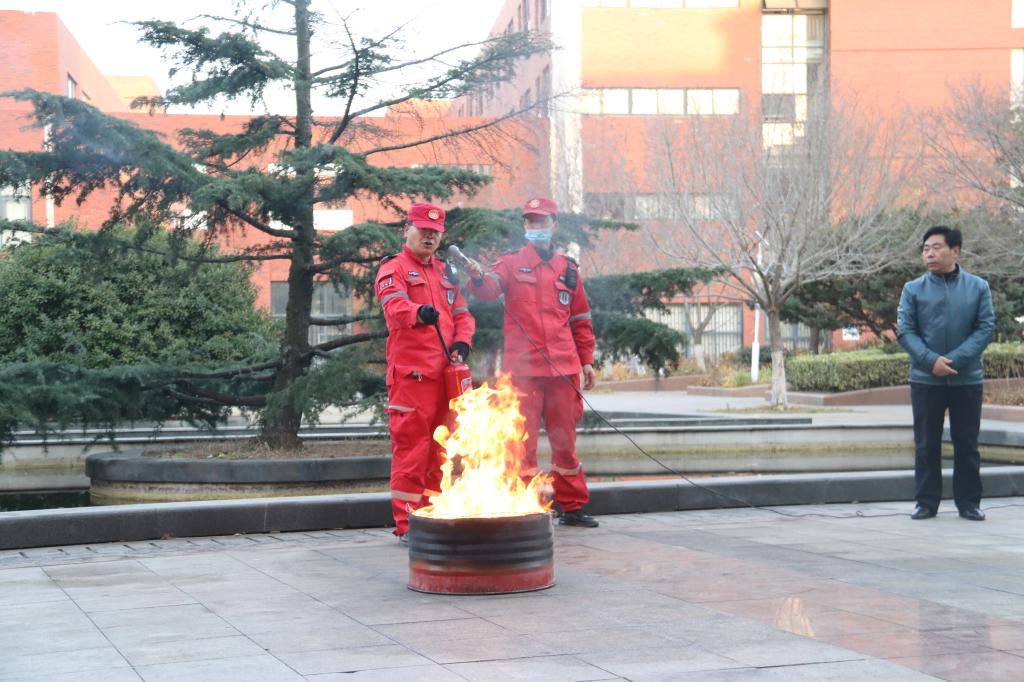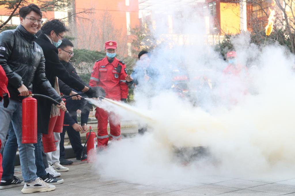 下午4点,本次消防演练活动正式开始。保卫处工作人员现场讲解了灭火器的使用方法,并按照规范步骤演示灭火过程。在接下来的灭火实践中,师生五人分为一组进行消防演练。