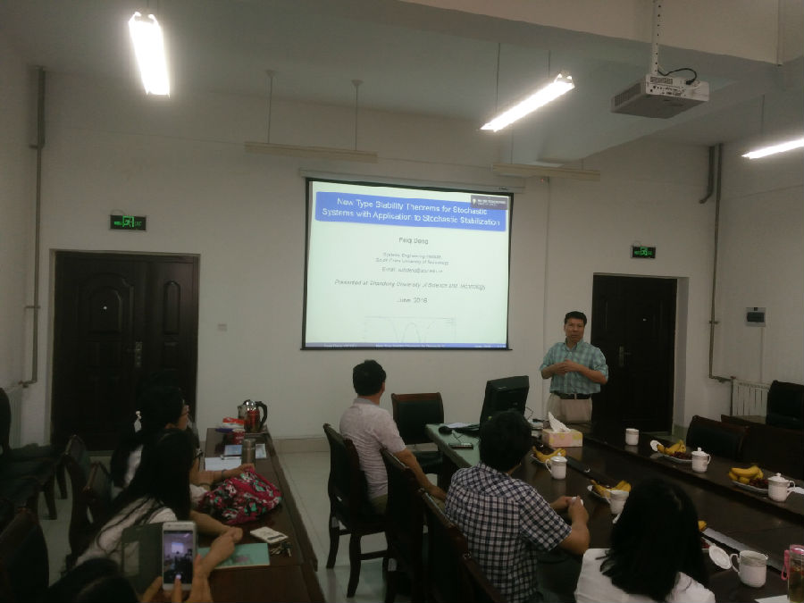 2016年6月11日下午,应“泰山学者”张维海教授的邀请,华南理工大学的邓飞其教授、田森平教授和邢双云副教授,分别作了题为《New Type Stability Theorems for Stochastic Systems with Application to Stochastic Stabilization》、《基于几何分析的迭代学习控制算法研究》和《Mean-Square Admissibility for Stochastic T-S Fuzzy Singular Systems Based on Extended Quadratic Lyapunov Function Approach》的学术报告。本次报告会在J9-525举行,张维海教授主持了报告会,部分教师和研究生参加了报告会。三位专家分别介绍了自己近期取得的研究成果,分享了他们的科研经验和感悟,激励青年教师和研究生们敢于创新、厚积薄发,勇攀科研高峰。整个报告会气氛活跃,学术氛围良好。此次学术报告拓展了研究思路和科研视角,对员工树立远大的学习目标起到积极的推动作用。