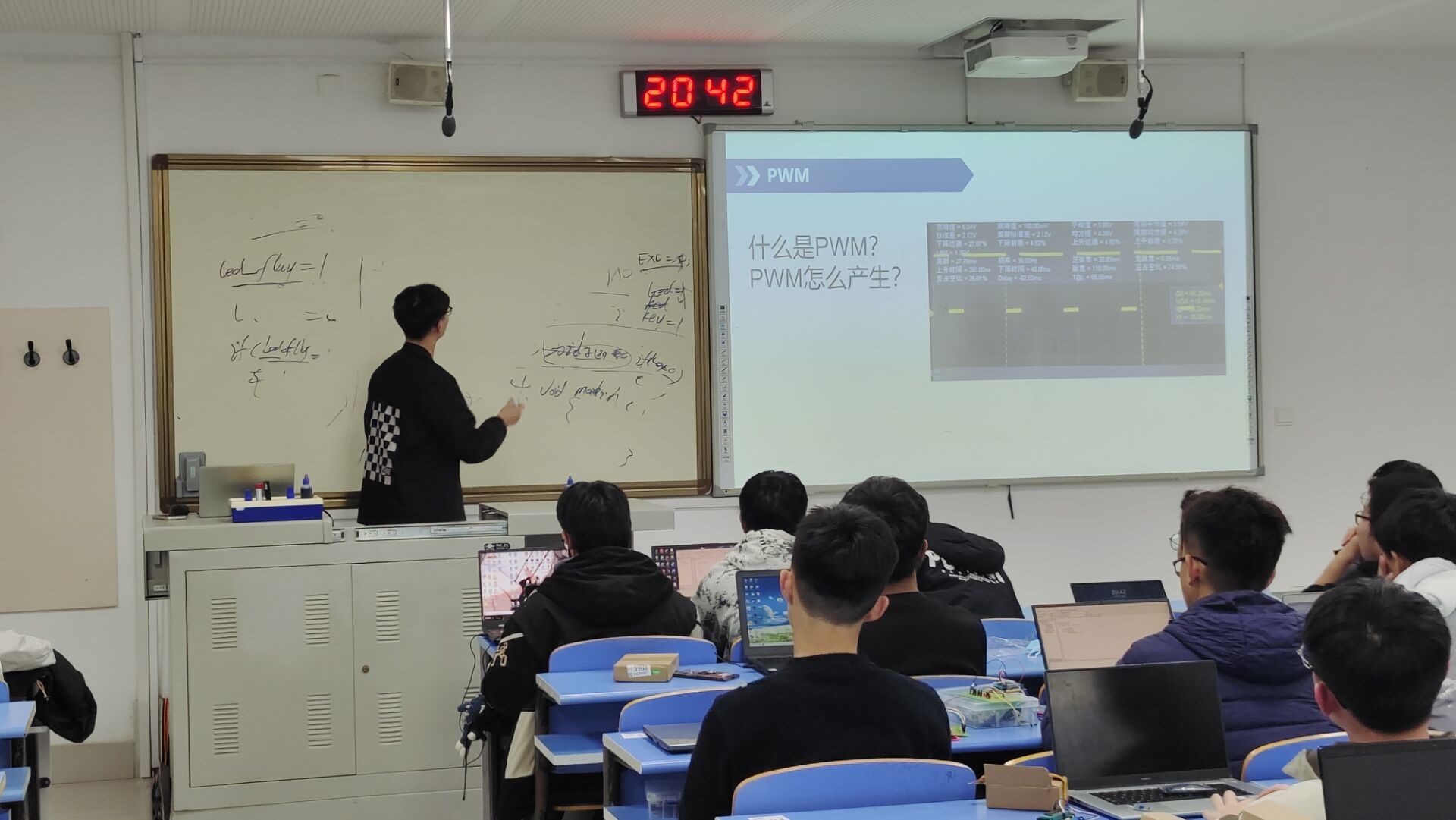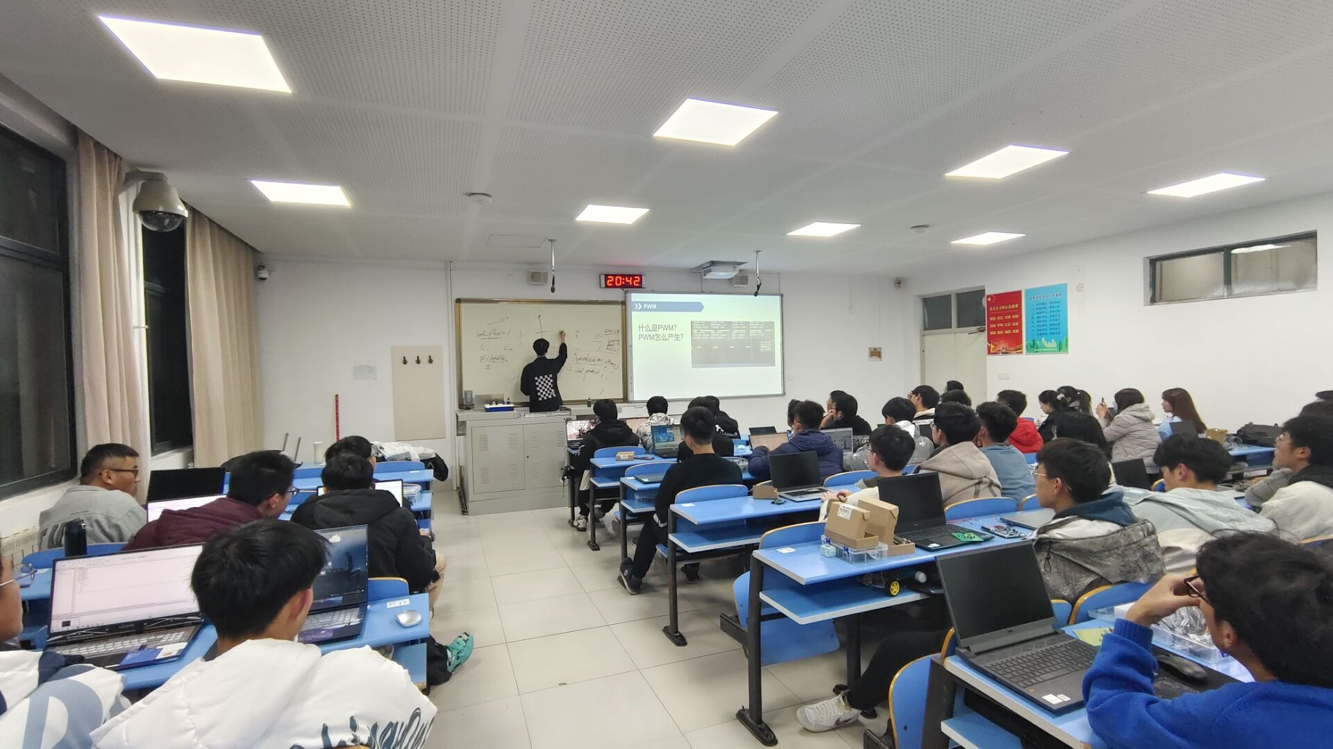2023年12月16日,J7-212,为了拓展单片机开发基础,介绍单片机的相关应用,现面向自动控制协会全体成员,举办此次讲座,以讲练结合的形式。向社团成员介绍单片机的中断系统有关知识,并对所学知识进行练习。活动过程中会出现有些员工不理解讲课内容的问题,但各个组长都及时做出调整,使绝大多数同学都跟上来了。各个组长及会长也是很认真负责,非常照顾绝大多数的员工。各位组长以及会长起到了良好的积极作用,积极上台鼓励同学努力学习,积极帮助同学解决问题。